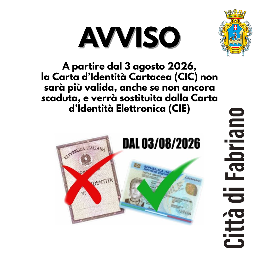 A partire dal 3 agosto 2026 le carte d’identità rilasciate su modello cartaceo non saranno più valide, indipendentemente dalla data di scadenza riportata sul documento. Presso l'ufficio anagrafe è possibile chiedere il rilascio della CIE. Tutte le info.
