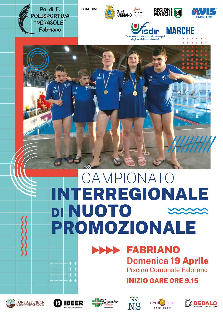 Domenica 19 aprile 2026, presso la Piscina Comunale di Fabriano, si terrà il Campionato Interregionale di Nuoto Promozionale, organizzato dalla Polisportiva “Mirasole” Fabriano.