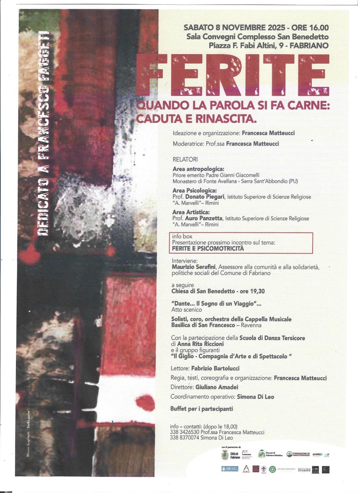 Sabato 8 novembre 2025, alle ore 16:00, presso la Sala Convegni del Complesso San Benedetto (Piazza F. Fabi Altini, 9 – Fabriano), si terrà l’iniziativa FERITE – Quando la parola si fa carne: caduta e rinascita, evento culturale e artistico dedicato a Francesco Fagetti, ideato e organizzato da Francesca Matteucci.