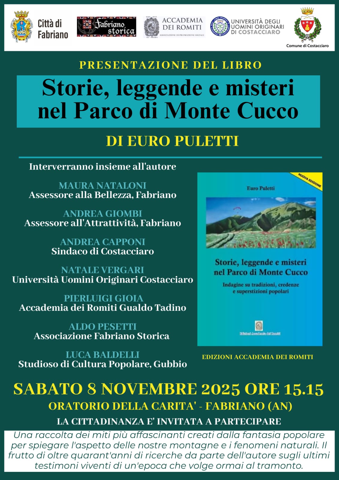 Sabato 8 novembre 2025, ore 15.15, presso l’Oratorio della Carità di Fabriano, si terrà la presentazione del libro "Storie, leggende e misteri nel Parco di Monte Cucco" di Euro Puletti, edito da Accademia dei Romiti.